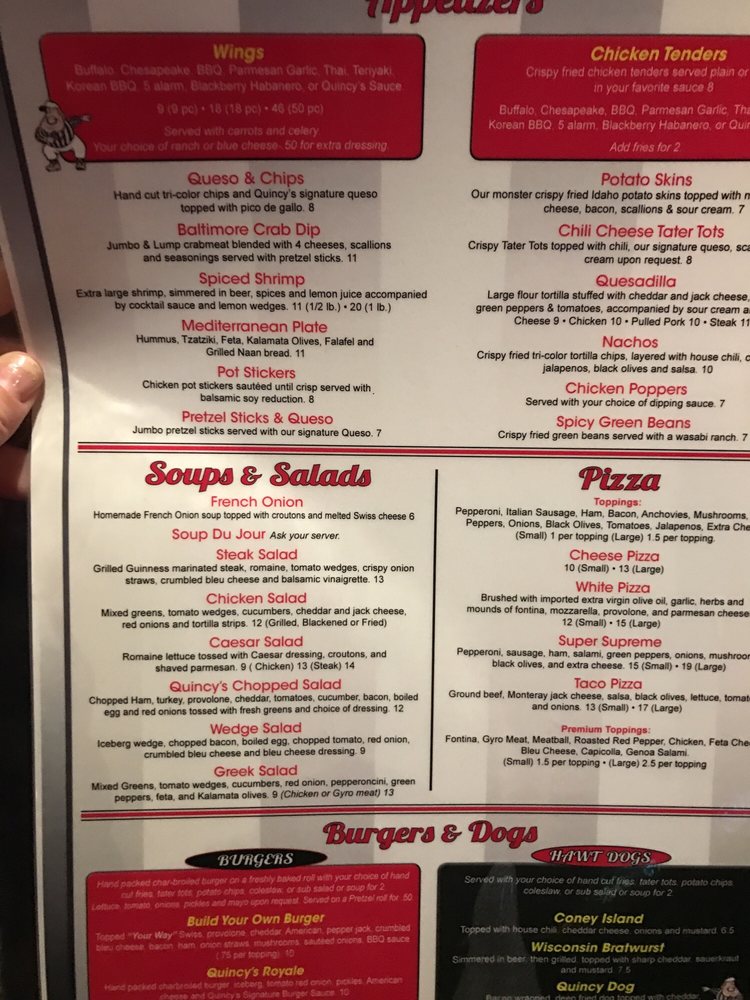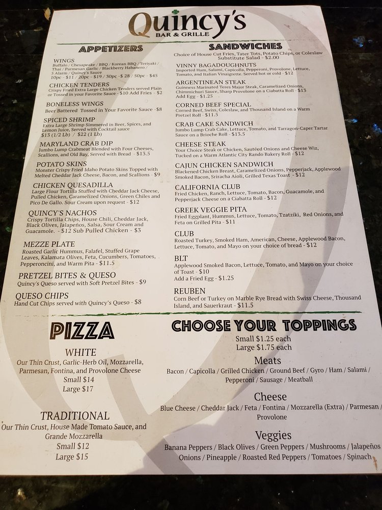 Quincy's Bar and Grille, an American restaurant located in Gaithersburg, MD, offers a diverse menu with options like sandwiches, wraps, appetizers, and salads. Customers praise the friendly staff, fast service, and delicious food. Standout dishes include the Boneless Wings, Cheesesteak Eggrolls, and Greek Salad. The ambiance is casual with amenities like outdoor seating, live music, and a full bar, making it a great spot for group gatherings and happy hours. With positive reviews praising the quality of food and service, Quincy's Bar and Grille stands out as a must-visit dining destination in the area.